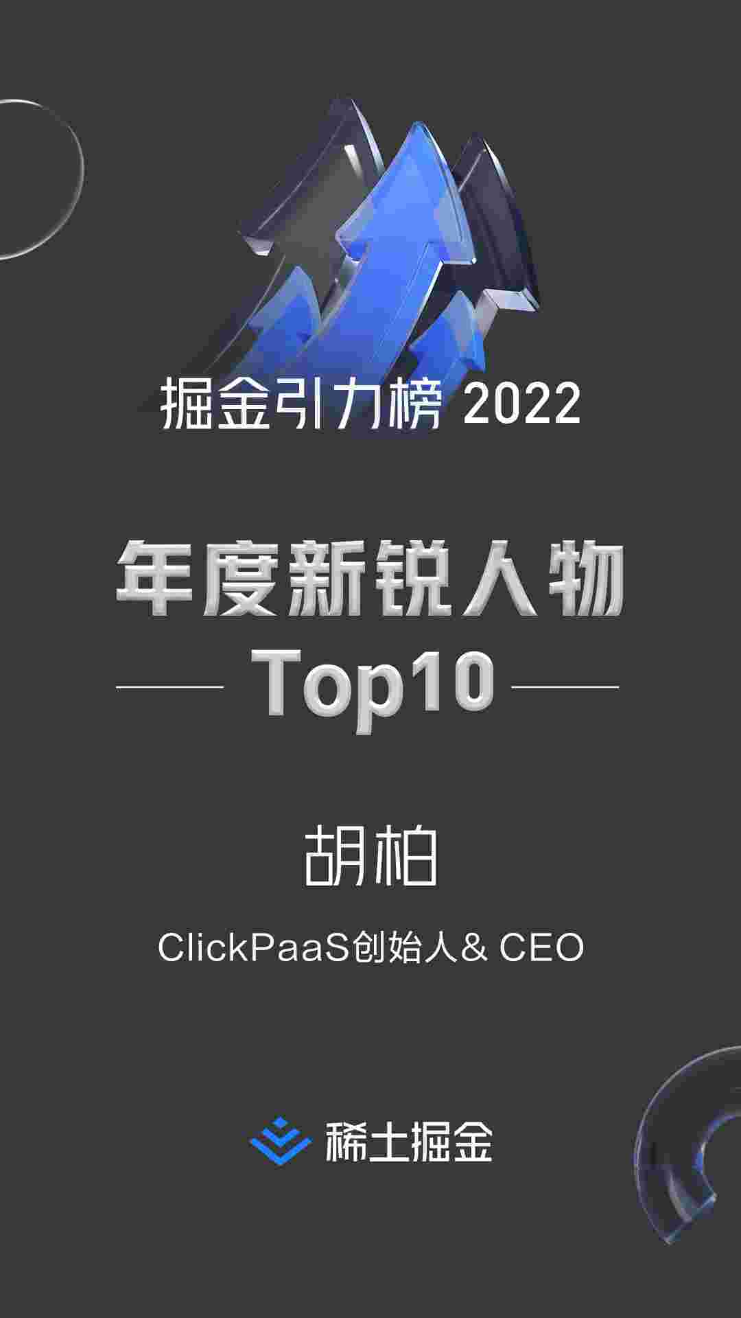 2022年1月6日,,,,稀土掘金社区第一届「掘金未来大会」成功举办,,,,会上发布了“2022 稀土掘金引力榜 年度新锐人物”榜单,,上海爱湃斯科技有限公司(简称圆梦钱包)创始人及CEO胡柏实力入选年度新锐人物TOP 10。。