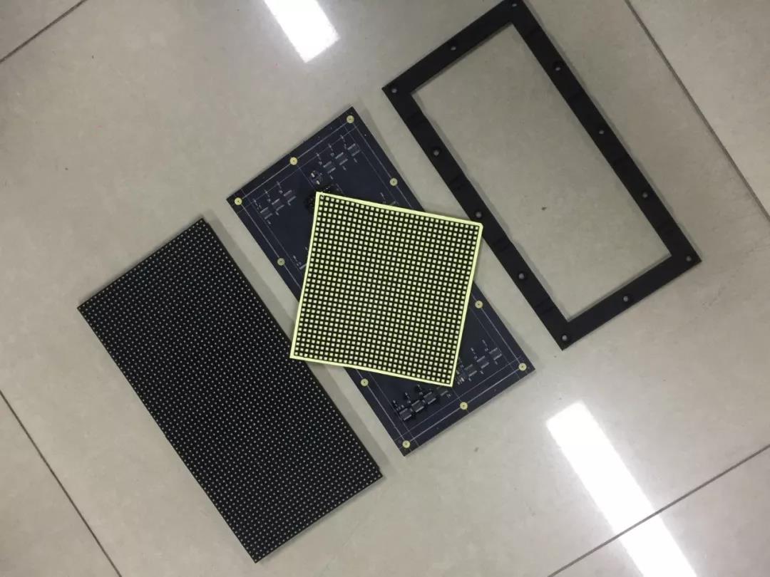 这是P4软模组的实拍分解图,,有FPC材质的柔性线路板、、、、软面罩、、、0.8cm厚度的软底壳以及贴好了灯的灯板。。。